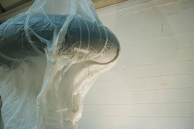 Burke’s work utilises the entirety of this gallery space. On the lower tier five long, large, white, amorphous sacks dangle from opes in the dust extractor pipe network that winds its way amongst the steel trusses overhead. Some of the sacks – made from plastic bags that have been glued together – are constrained by inflated rubber tyre tubes. Fans have been fitted into the overhead pipes creating a sort of closed system of pneumatics that slowly inflate and deflate the dangling, synthetic lungs. These heaving shapes, are defined by the confining rubber-tube-structures that are suspended at different heights along the dangling sacks, which alters the inflated shape; that at once avoids designation and yet, expresses the space between structure in a languid way.