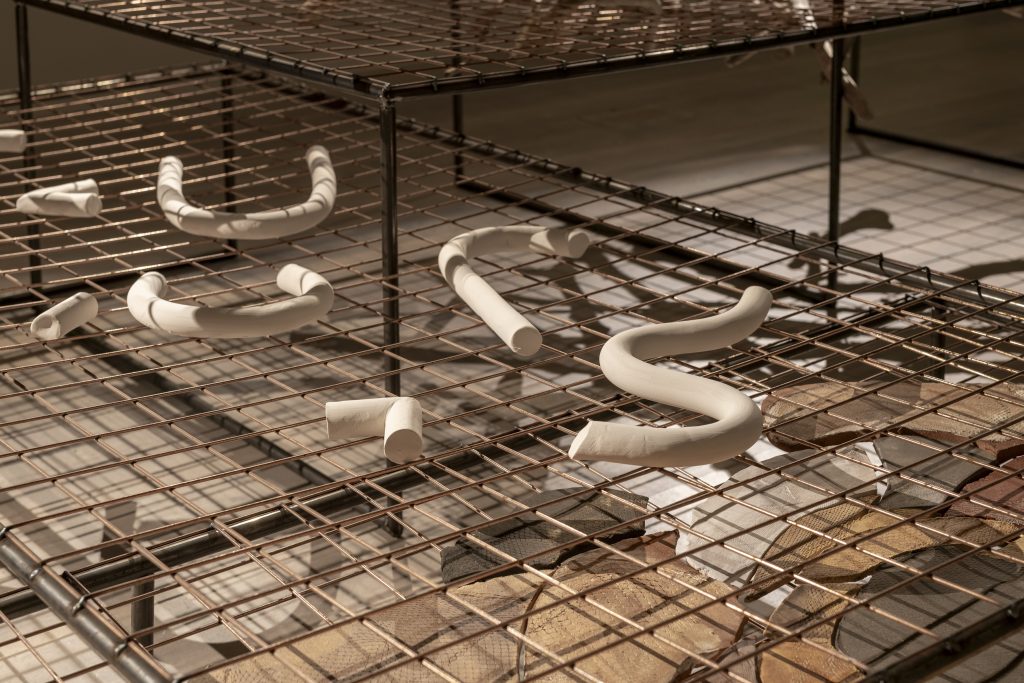 The third gallery contains another arrangement of objects – animal hides figured in scaly clay, suspended steel curves that mimic the whirlpool’s arcing currents. In the centre of the space stands a grid-like formation called Strata (2025). Consisting of four overlapping mesh levels on which a handful of small fired objects has been arranged for display, it is an iteration of a form that appears throughout Knežević’s work: complex arrangements displaying difference and relation, in which the conspicuous properties of materials are played out against one another in contrived, dramatic scenes. Here in the dark, the objects are laid out as if for classification, but the attempt fails: driftwood explodes through the mesh, and instead of being categorised, the mute, primordial objects are left to languish in their own shadows.