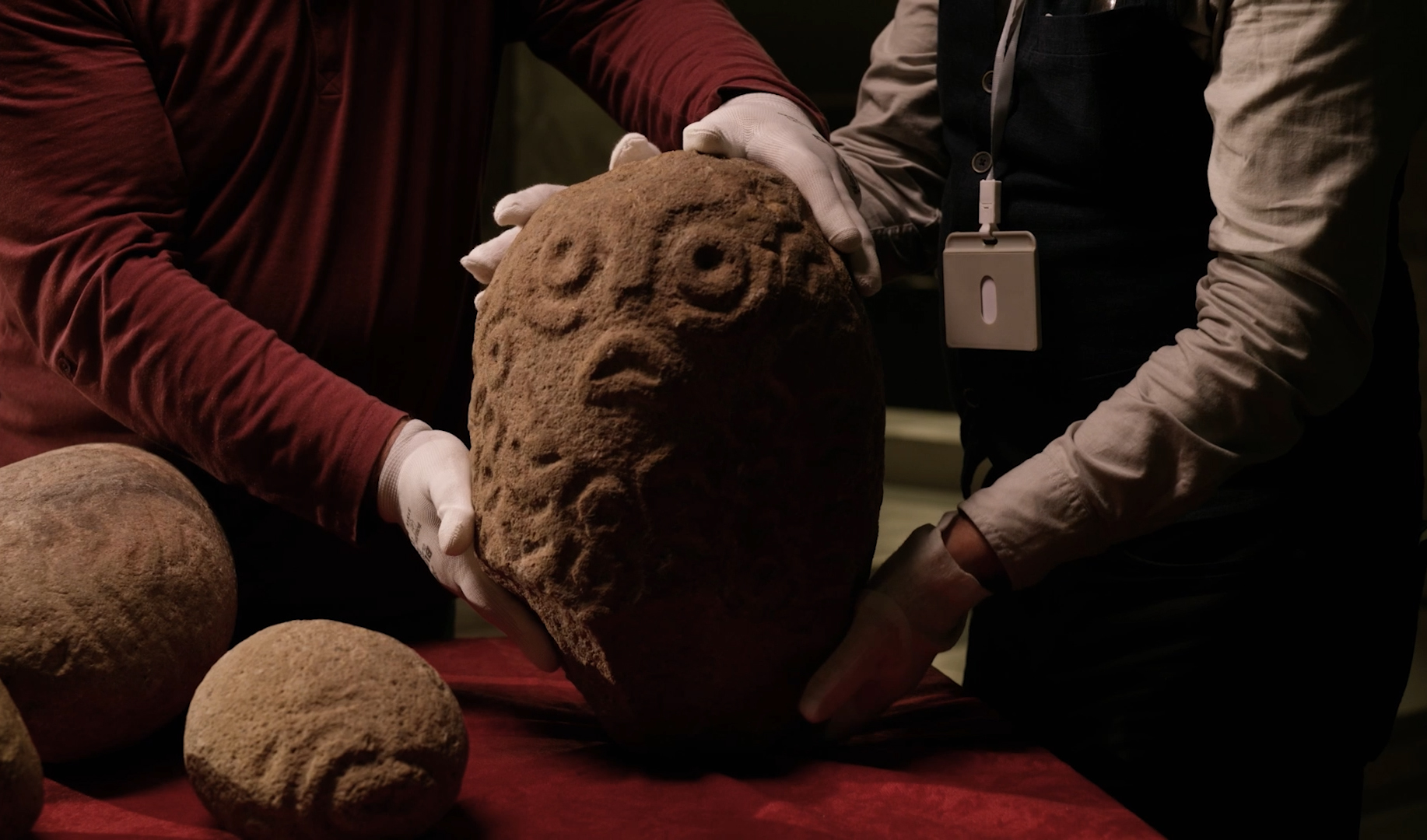 Both the gorge, Gvozdene Kapije, and the dam, the Đerdap, play a central role in Gvozdene Kapije (The Iron Gates), Barbara Knežević’s recent exhibition at Solstice Arts Centre. (A touring version of the show opens on 4 October in Sirius Arts Centre, after which it will travel to Wexford Arts Centre, before finishing its run at the Regional Cultural Centre in Letterkenny.) The exhibition tells the story of the Iron Gates through a singular filmic and material language, composed in part by a range of organic and industrial matter – jesmonite, driftwood, mild steel, clay, Serbian jezik (tongue) – and in part by a forty-six-minute film, also called The Iron Gates. The film opens in a large, windowless setting, where an archaeological survey of sorts appears to be underway. One by one, stones are laid out on top of a deep red tablecloth, over which the camera passes in a slow, left-to-right tracking shot. Cutting to a piece of archival footage from the dig, we watch as soil is brushed from the face of a rock, revealing a fishy mouth and wide, stunned, staring eyes. Then, the stone begins to speak.