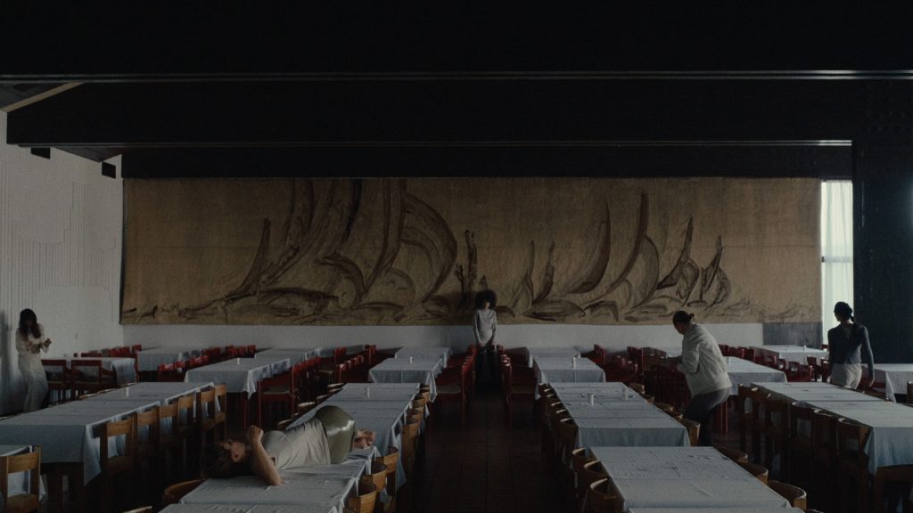 Throughout the film, Knežević and cinematographer Dušan Grubin make repeated use of slow, left-to-right tracking shots – along a welded chain tapestry, along the reconstructed bank of the Danube in the Museum of Lepenski Vir, along rows of steel blades lying idle in the grass in a remote storage facility – inviting the sense that a transcendent presence is presiding over the dialogues, as though the film (or the world) was witnessing itself. The film’s self-consciousness is most apparent at the outset, where in a conspicuously movie-magic moment the first line we hear is: ‘Sound?’ / ‘Rolling.’ / ‘Action’. This quality surfaces again in the final image, in which five actors – playing the Danube, Moruna, Treskavac, Water Fairy, and Đerdap – are shown recording voice-overs in a studio. These interpolating scenes perforate the container of the story, drawing attention to the vernacular form of its delivery, and highlighting the artist’s presence within the assemblage. In the film’s final moments, a group of figures dance in distinct solos in a dining hall. Some still, some frantic, they eventually converge into a cluster in the centre of the room: five forces, five actions, each one vying for space beside the others. As the scene builds, the sounds of steel clanging and rumbling machinery become the grinding of a cello that, together with a wordless vocal track performed by Serbian ethnomusicologist Tijana Stanković, accompanies the dancers in a final, climactic montage.